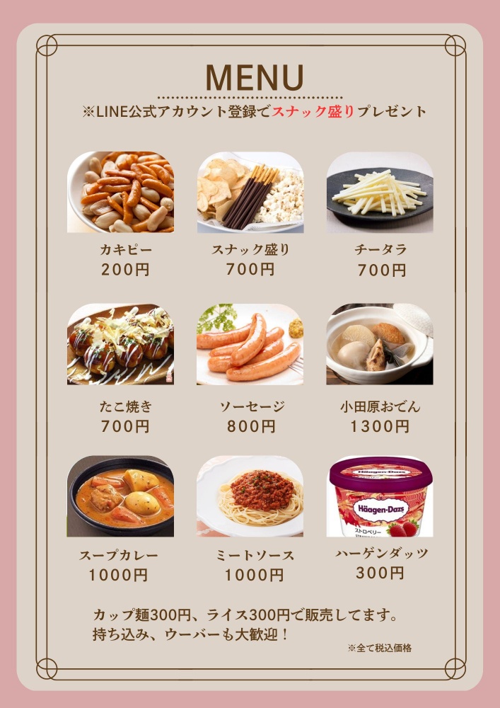 営業時間PM/20:00~3:00ラストイン0:00⚫️喫煙OK⚫️お一人様はカウンター席もございます。⚫️グループ、ファミリー、カップル大歓迎‼️⚫️フード、ウーバー持ち込みOK